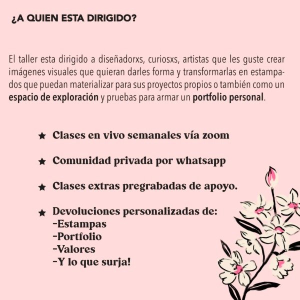 El taller esta dirigido a diseñadorxs, curiosxs, artistas que les guste crear imágenes visuales que quieran darles forma y transformarlas en estampados que puedan materializar para sus proyectos propios o también como un espacio de exploración y pruebas para armar un portfolio personal. Que quieran contar con un espacio todas las semanas para hacerse el tiempo de crear en compañia.